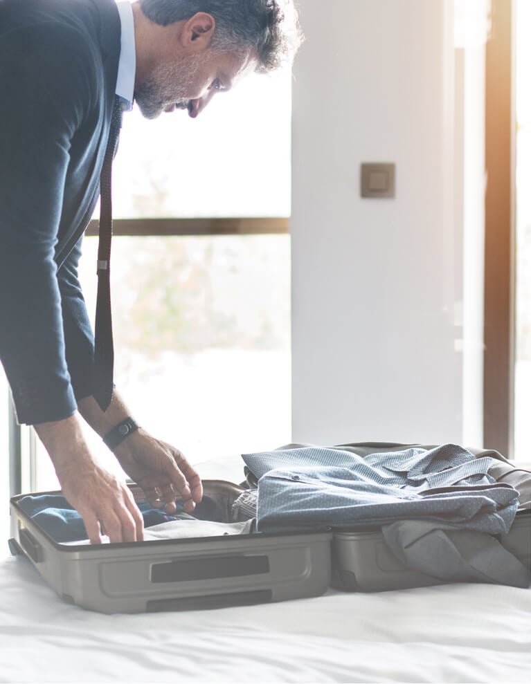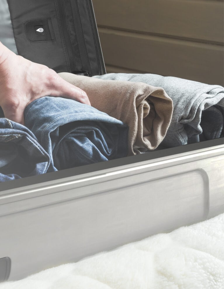 Roll up garments that don’t wrinkle easily, such as cotton t-shirts, denim jeans and gym gear, and fold clothing that does, such as dress shirts and silk and linen pieces. After putting your shoes at the bottom of the suitcase near the wheels (and layering your suit jacket if you have one) add lines of rolled-up garments. Layer your folded pieces on top of those.
